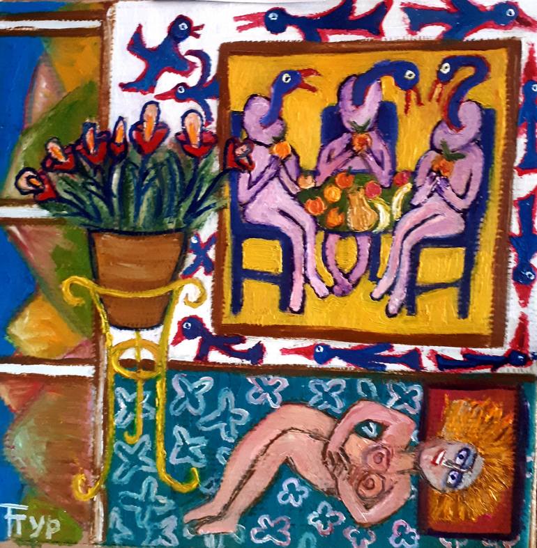 Siesta under a new painting against the backdrop of mountains on the left", 40 by 40, oil on cardboard, on a stretcher, Tanya Turanova (Vasilenko), Vanadzor, Armenia, 2023