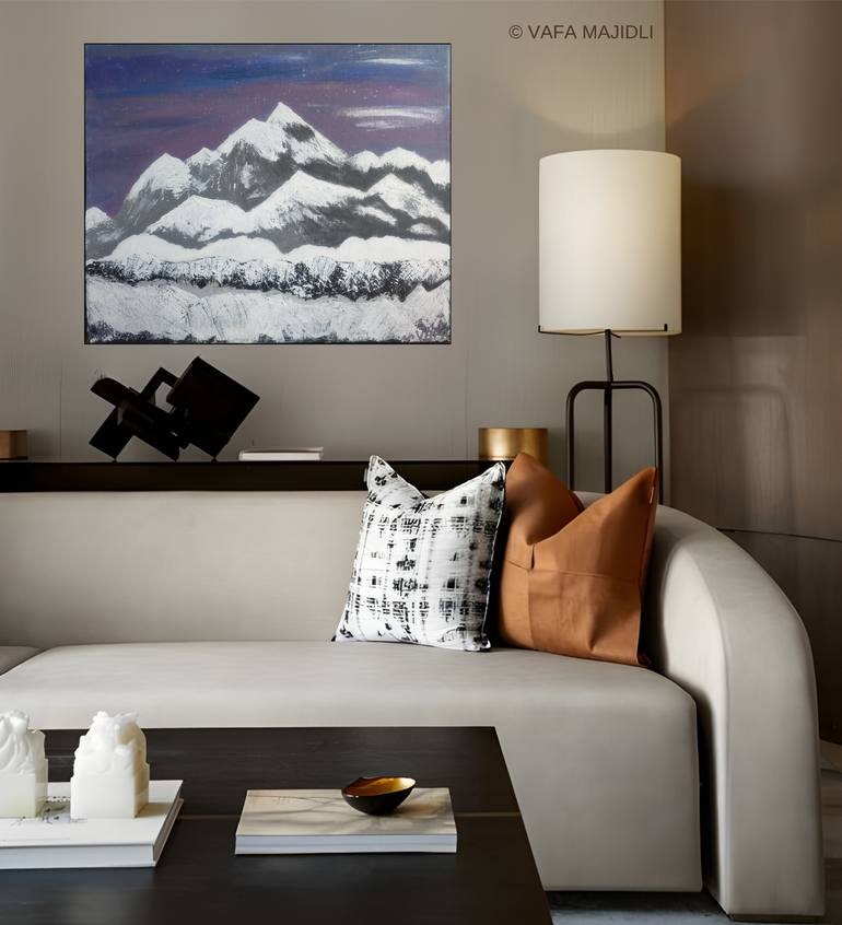 "Silence of Mountains" is a breathtaking landscape painting that captures the majestic and imposing presence of a snow-covered mountain range set against a serene, starry twilight sky. In the foreground, the scene features a pristine, snow-laden terrain with subtle dark patches of rocky or densely v...