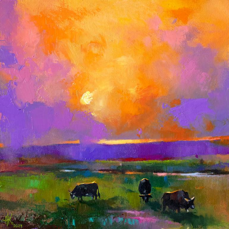 This artwork was inspired by the calm yet striking beauty of a rural sunset. The vibrant oil-painted sky, full of fiery tones, contrasts with the minimalist, shadowed forms of cattle, symbolizing the union between the fleeting moments of twilight and the enduring essence of the land. It’s a tribute ...