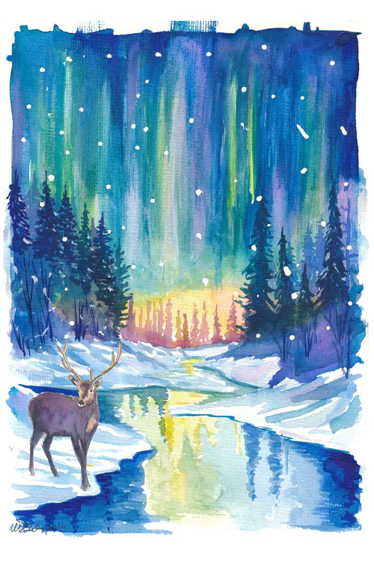Silent Stag Beneath the Northern Lights' Glow - watercolor on paper