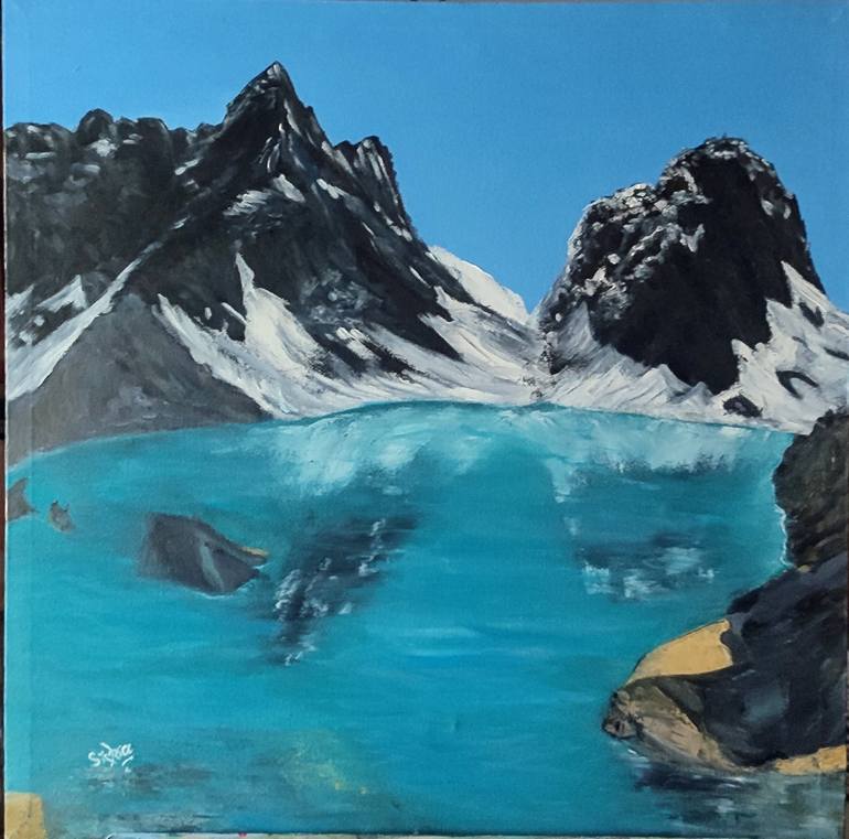 "Silent Waters" is a captivating mountain landscape painting that portrays the tranquil beauty of nature. The artwork features towering, snow-capped peaks rising dramatically against a clear, vibrant blue sky. At the center lies a serene, glassy lake with reflections of the mountains, adding a sense...