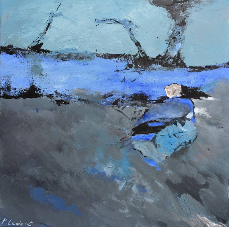 This captivating work, dominated by a palette of blues and grays, evokes an atmosphere of introspective calm. At the heart of the composition, a solitary figure appears absorbed, seamlessly integrating the surrounding tones. The dynamic brushstrokes create a rich texture, giving the landscape a stri...