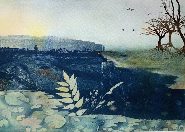 When a photo and a watercolor mix... I used a photo taken in the Balearic Islands on which we see in first plan, rocks, then a silhouette and white houses in the distance... Next to this landscape, I added an imaginary landscape painted in watercolor: trees, water lilies and touches of colors sca...