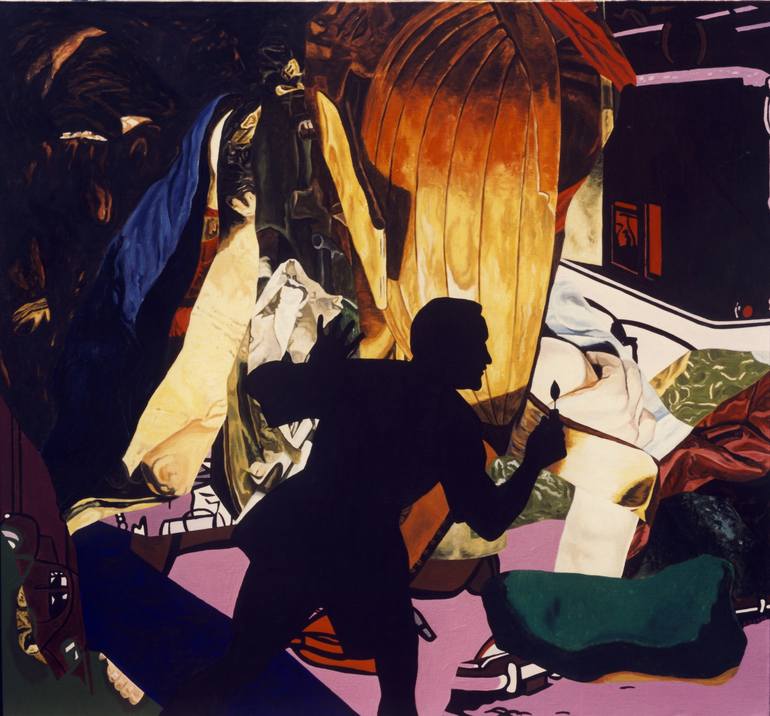 As in Silhoutte I and II, the background for this painting is based on a collage formed by different pieces of reproductions. The figure in the foreground is a silhoutte holding a lit matchstick of which the flame is also black. It suggests that the light emitting from the background is so strong ...