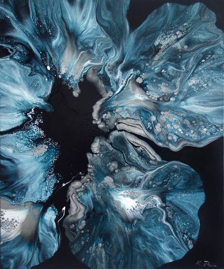This is an floral abstract acrylic painting on canvas. Inspired by iris flower beauty. *Title: Silver Iris II *Size: 24 (height) x 20 (width) x 1.5 (depth) inches *Materials: Acrylic paint on wrapped cotton canvas *Style: Abstract, Modern, Contemporary *Finish: Semi-Gloss varnished for long lasting...