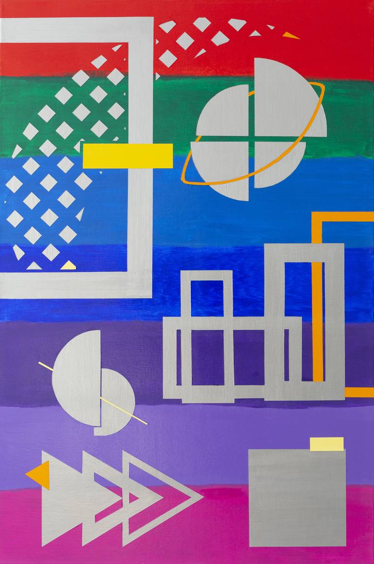 "Silver Shapes" is a striking acrylic painting on canvas that immediately catches the eye with its bold composition and mesmerizing color scheme. The artwork features a series of hard-edged shapes, each one rendered in shimmering iridescent silver, that are arranged in a dynamic, geometric pattern a...