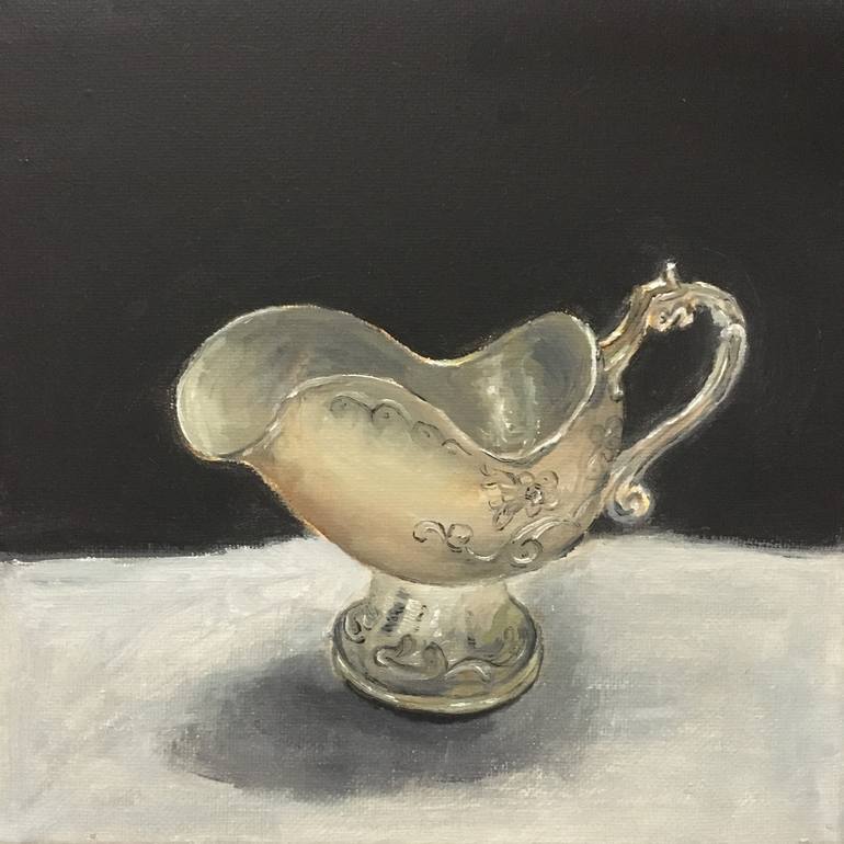 This piece is one of a series of silver tableware. I named it S1-Candy Dish. This series of three pieces (candy dish, tea pot, and coffee pot) are in black and white (grey) with a simple background color. They are painted on stretched canvas and ready to hang on the wall. Each piece has a signatur...