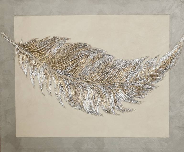 SILVER FEATHER. Sold. I completed a new Custom-made Silver Feather. The deep texture is made with a textured paste, liquid and leafy gold gives an indescribable shine. The background is made with Italian interior silk. Silver edging and top-of-the-line painted ends - no frame required. Canvas 5...