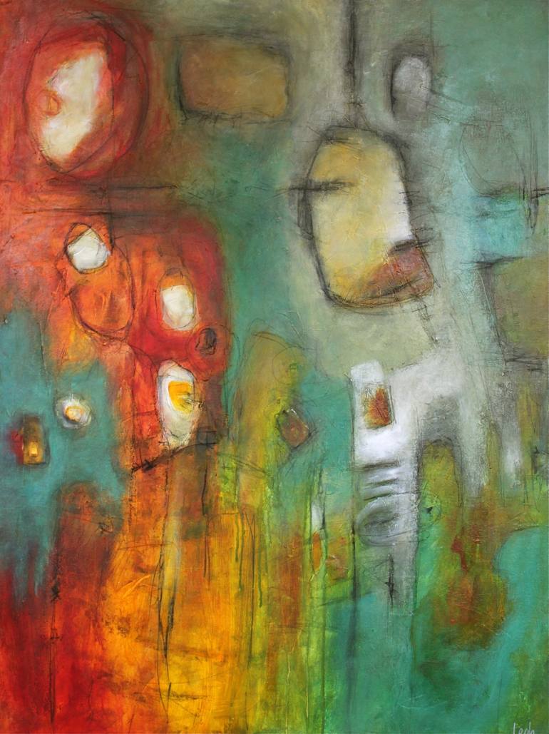 This is an original, one of a kind painting on a thick rectangular gallery wrapped canvas; hand painted by me in February 2015. This original painting is titled 'Simpatico'. This large painting features an rich color palette of red, yellow, orange, green, teal, turquoise, rust, chartreuse, beige,...