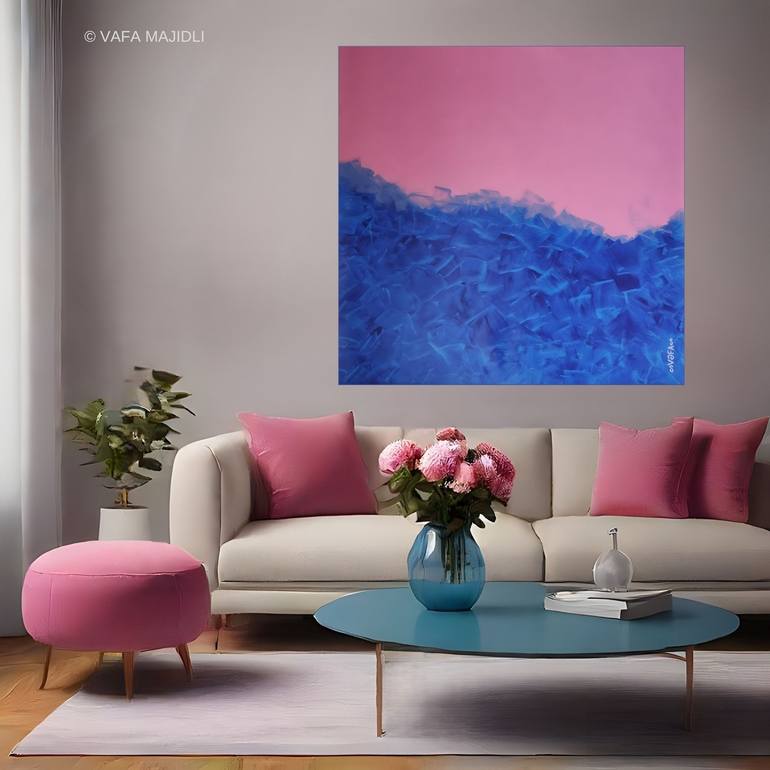 Sweeping across the canvas, 'Simple Freedom like Ocean Breeze and Rose Petal Sky' transports viewers to a dreamlike realm where serenity meets whimsy. As the blue hues of the lower half of the painting evoke the calming vastness of the ocean, the pink-tinged upper half whispers sweet nothings of rom...