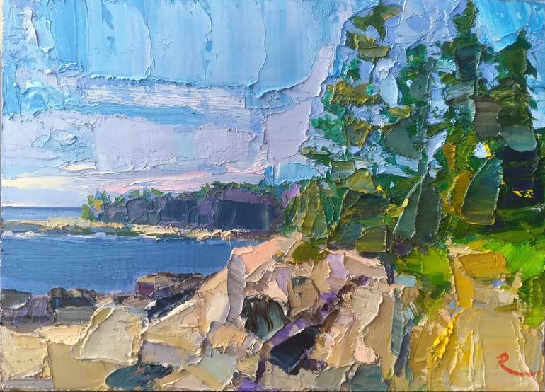 THIS PAINTING IS CURRENTLY EXHIBITED AT A BRICK-AND-MORTAL GALLERY TILL APRIL 1,2024. Original oil on canvas painting stretched on a wooden frame. An impressionistic etude of the Atlantic coast landscape. New England coast. Sea breeze through the pines on a rocky shore. Heavy impasto. Master-qua...
