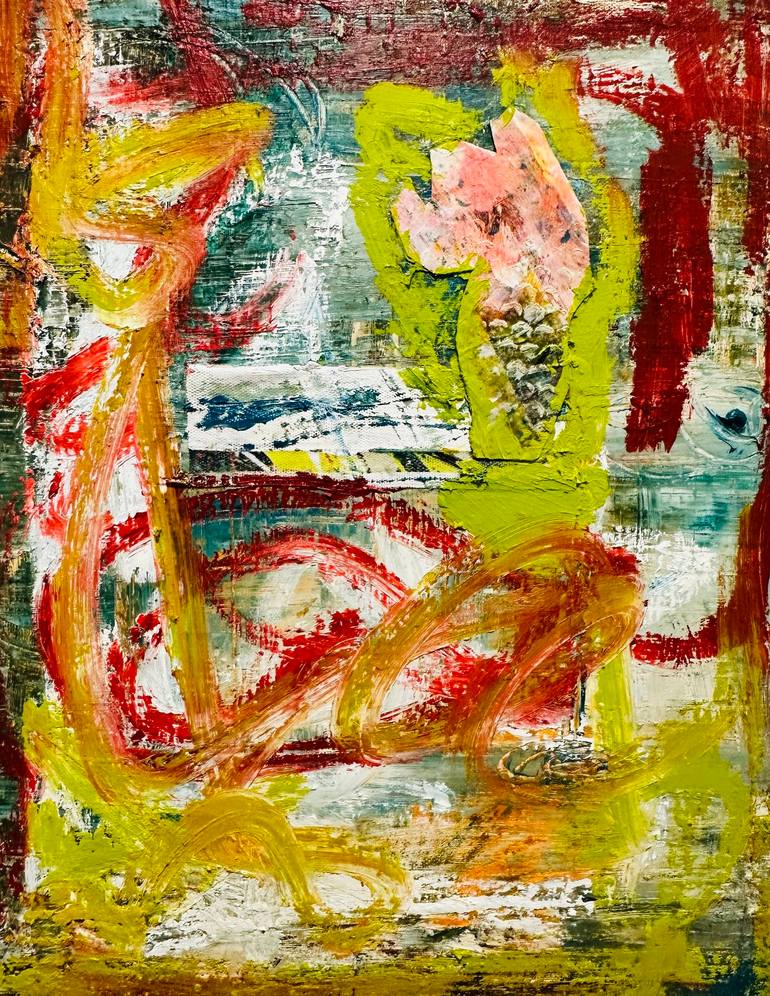Single Bloom is an abstract expressionist oil painting on canvas. Except for the paper collage element of the cactus bloom the painting was unplanned. I am an intuitive painter and I let the painting tell me what it wants. Therefore, I am the ‘assistant painter’ to the work.