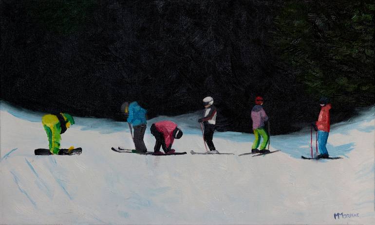 I made this subject after going skiing in the Alps. I was particularly interested in the skiers' colors against the black and white at the back. I painted it with big brushes to avoid making too many details.