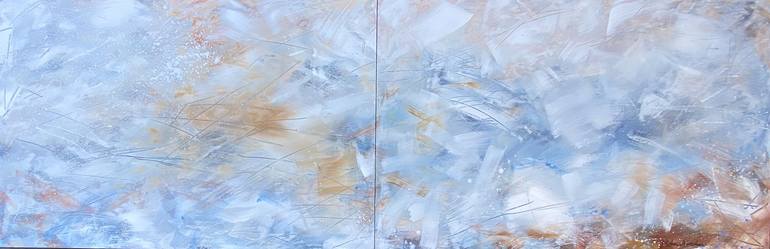 A group of birds flies away in the watness of the Sky. In the clear clouds,the graffiti of the larks witness to their passage.the volute mouvements trace a choreography of feathers....the Sky is blue and peace reigns The work uses the technique of masking An old technique wich consists in gluing ...