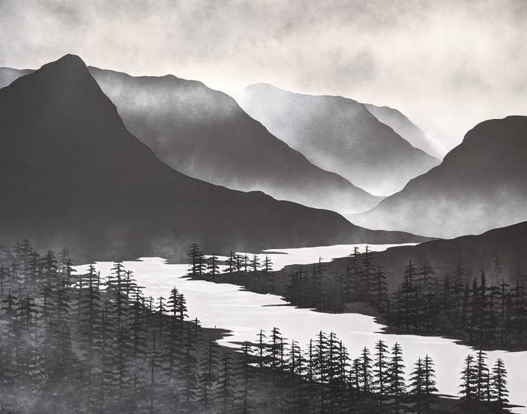Art wasn’t an option for Bloomfield after school, as he needed a steady paid job. But one day, to be different, he painted a birthday gift for a friend. They hung the artwork up right away, which spurred him on to paint again, and he hasn’t looked back since. Bloomfield’s art combines ideas of his two favourite artists [Rothko and Gormley] by placing figures in stark and sometimes harsh landscapes with unyielding horizons. His favourite material is spray paint: “I often used spray paint as a teen when out creating guerrilla art with friends in London. The idea of using street material in a more traditional way appeals to me”. He prefers working with the cool tones of greys and black as it leaves more to the viewer’s imagination. The art Bloomfield creates comes from endless introspection, and a variety of inspiration. His work is thoughtful, and presented in an accessible way for a wide audience. In his own words: “Everyone should have an original painting in their home”.