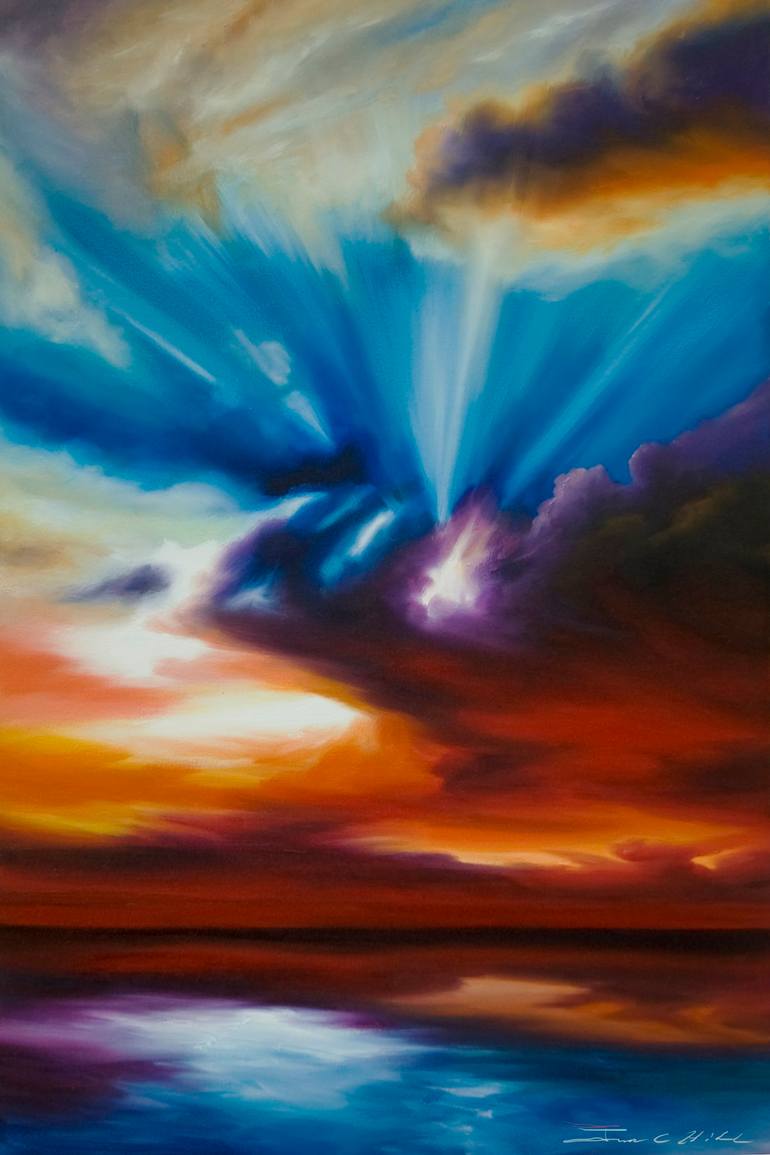 This is an evocative oil painting titled "Skyburst III", an exquisite piece that captures the dual nature of serenity and drama in the sky. At the heart of this painting is a breathtaking contrast between the fiery warmth of a sunset and the cool tranquility of a rising night. I decided to employ a ...