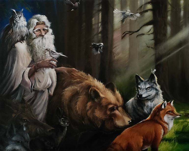This captivating painting portrays a serene forest scene where Slavic god Veles, adorned with a flowing white beard and robes, stands peacefully among various animals. He gently holds a bird in his hand while others rest on his shoulders, symbolizing a deep harmony with nature. Surrounding him are a...
