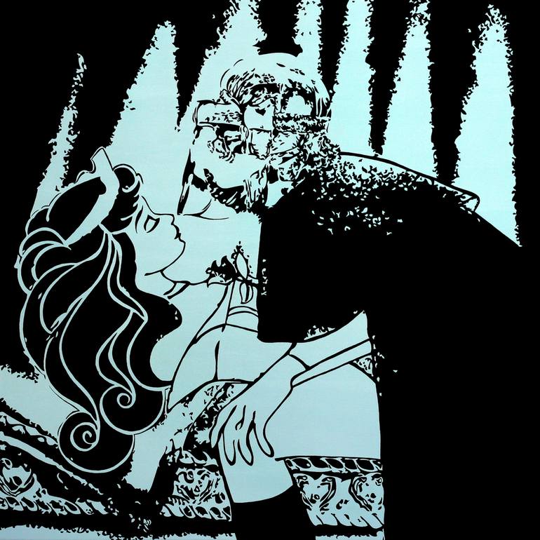 “Sleeping Beauty feat. Pandemic” (teal) from the series “As The World Turns II”, 2020. In “As The World Turns II” I put two different worlds into one context: the world of animated cartoons and the world we actually live in. This “marriage” produces a new world that feels so wrong but also so true...