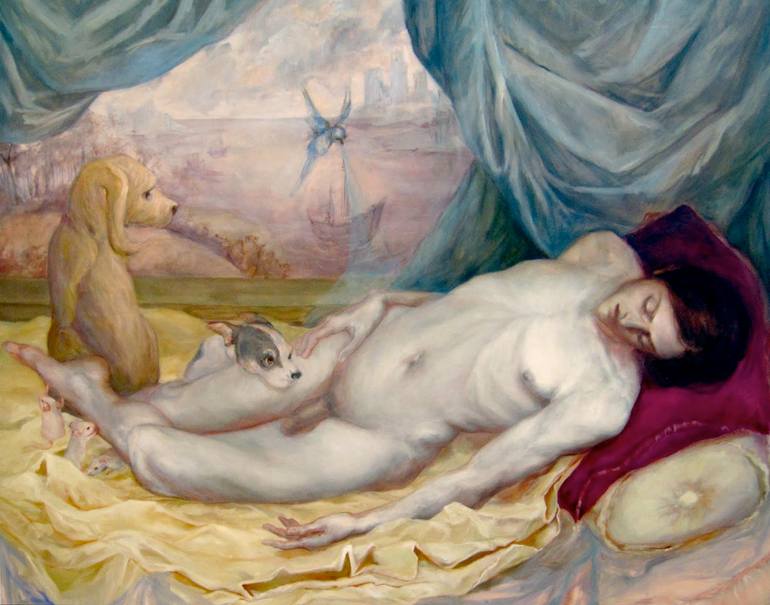 Lauren Woods draws from art history, religious iconography, and comparative mythology to construct paintings that explore the nature of images and the transformational characteristics of the human form. In 2006 Lauren received her BA in Studio Art from Spring Hill College. She then completed an MFA in Painting from the New York Academy of Art in 2010. Currently, she is an Instructor of Visual Arts at both Spring Hill College and The University of South Alabama. In addition to painting, she also has an extensive background as a classical ballet dancer, and her work is influenced by the ethereal and lyrical aesthetic of the art form. Artist Statement In my current body of work, paintings become a theatrical space to examine notions of gender, sentimentality, desire, and beauty. With tableau-style settings and appropriated death and resurrection imagery, I stage scenes overwrought with artifice to create a delusive vision of whimsical romance. Poetic situations emerge from mixing revered sources of art history and religious iconography with disoriented signs of masculinity and femininity. Remaining vulnerable to interpretation, these images continually oscillate between contradictory states, such as informed innocence and playful seriousness.