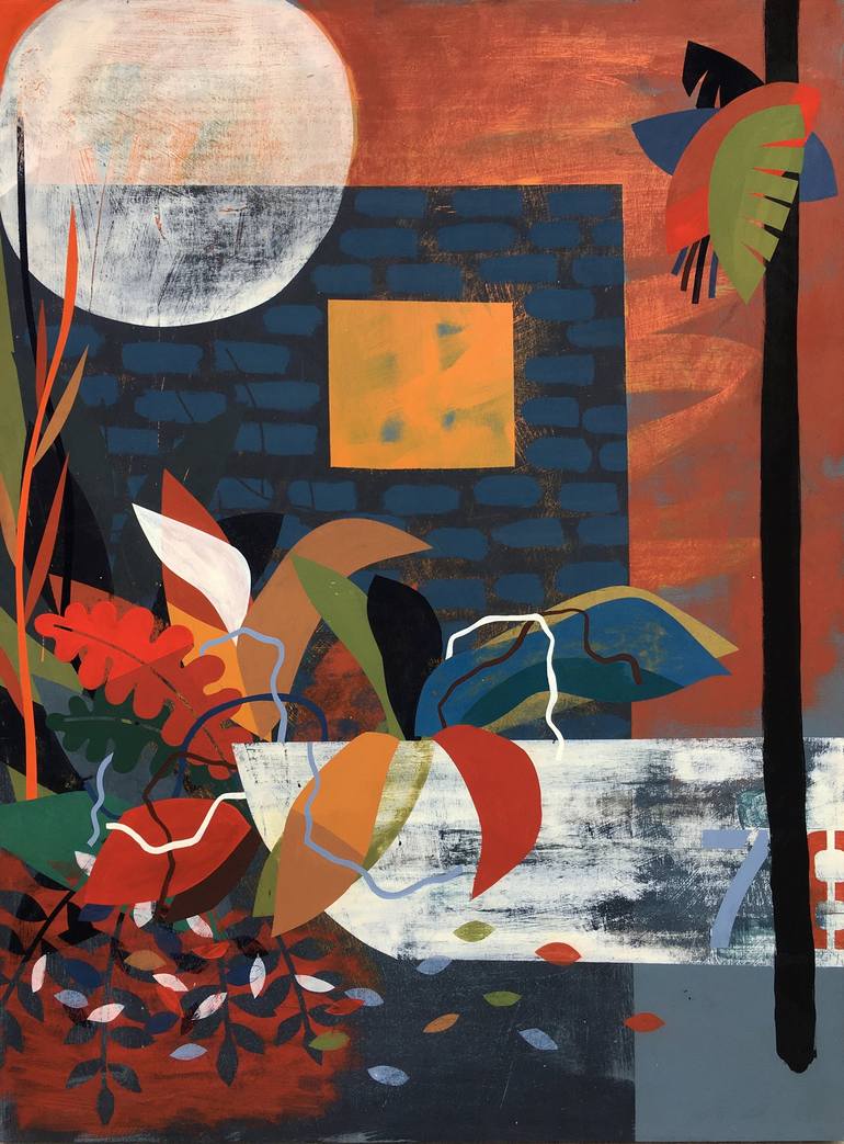 "My images often start from the memory of a certain scene or moment that really struck me. Usually it’s one that evokes a very specific time, place, or feeling. Sometimes I don’t necessarily understand why the image resonates so much, I just know that it does, and making the painting becomes a process of trying to understand why.” My work examines universal themes of home, belonging, and connection, and our transient place within the continuum of the natural world. These thoughts take shape in paintings that combine representations of places, people, plants and animals, layered with abstractions that embrace metaphor and ambiguity. Recurring motifs of boats, houses, and travelers, reflect on life’s journeys, arrivals, and moorings. My studio is next to an urban farm, which feels like a space of optimism and renewal, with the rhythms of planting and harvesting subtly shaping the images I produce. During the pandemic I started painting images of plants, often in vibrant colors - a coping strategy of defiantly creating some beauty amid the darkness.