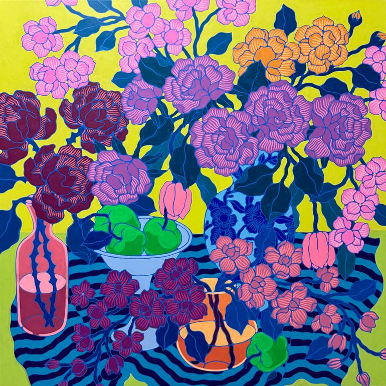 Raised on the coast of Maine, Sarah Ingraham (b. 1994) is a Brooklyn, New York-based painter whose practice spans painting, murals, rug making and wallpaper design. Strongly influenced by her background in art history and reverence for decorative traditions in craft, she looks to ceramics and textiles from all over the world as inspiration in her work, which combines ancient motifs with a fresh palette. Sarah’s paintings draw upon the long lineage of still-life and landscape painting, recasting these genres in a contemporary light to explore themes of overindulgence, pleasure, and vitality.