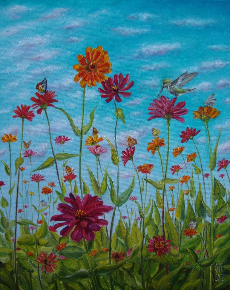 Original hand painted oil on canvas. Colorful, lovely, vivid spring scene with flowers, butterflies and one hummingbird. Made with love... Created with multiple layers of oil color. If you have any additional questions about this artwork, feel free to contact me!