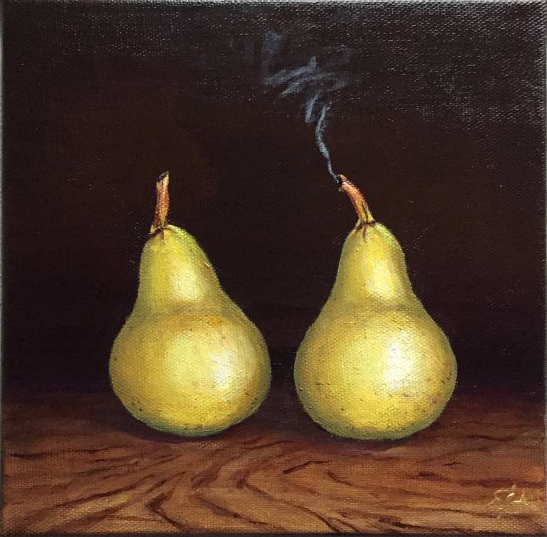 Pears are beautiful and nouriching and full of vitamines. Here is a funny small painting. Everyone can paint a pear, and the artist prefers to do it her way. And yes, smoked pears taste wonderfull :o) Can't imagine though how the smoking pear tastes... Fine acrylics on a aquality canvas. Ready to h...