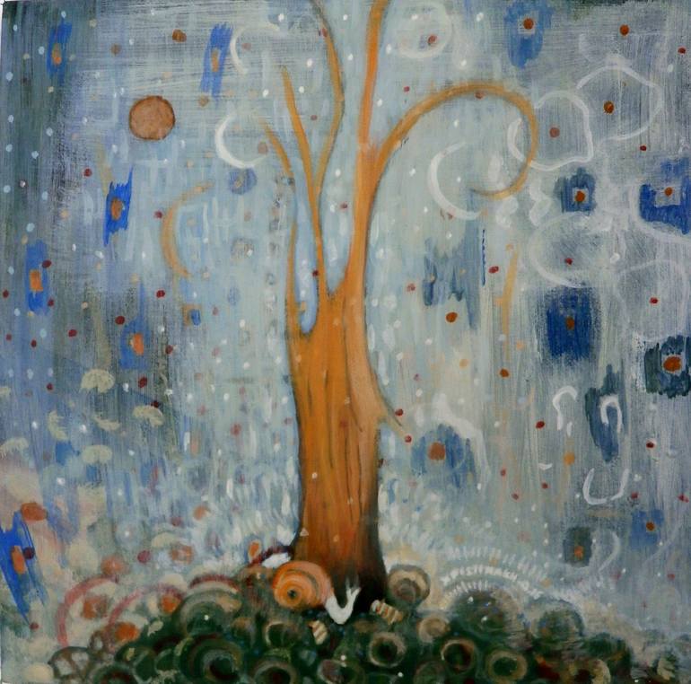 Snail Size: 30 W x 30 H x 5 cm acrylics on canvas Original artwork SOLD Looking at the artwork, you first see the tree and the patterned sky. But there is a snail on the bottom, maybe more and this is the title of the painting to give importance to even the smallest and most humble creature.