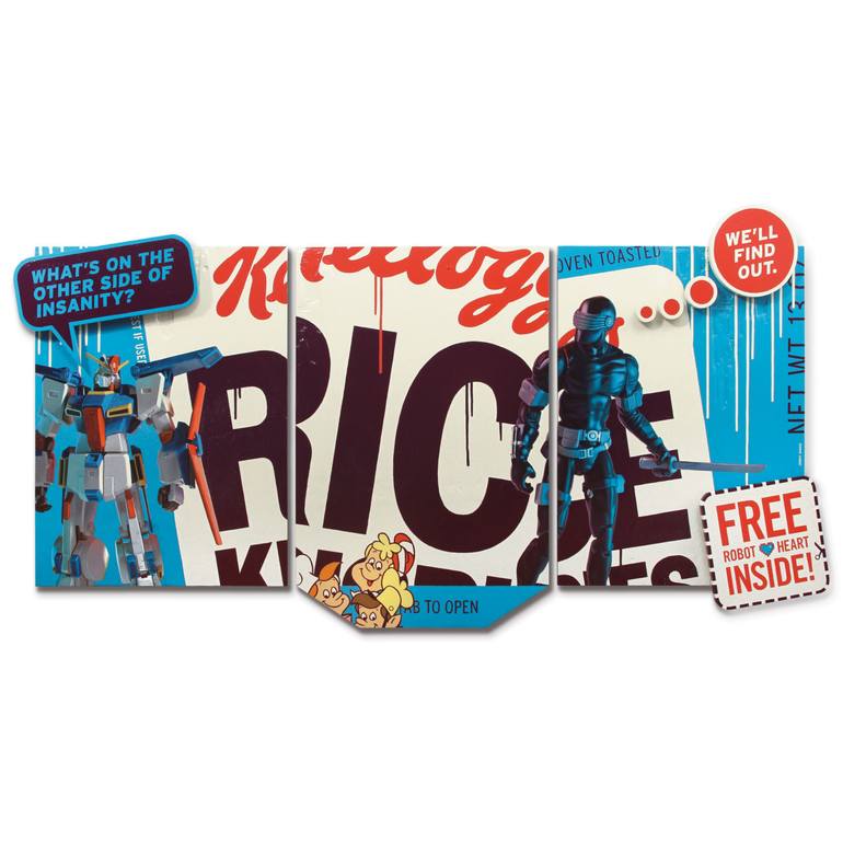Overall dimension is approximately 72″w x 36h″ Oil and acrylic on three hand-chiseled, archivally coated, wood panels. Each panel measures 24″w x 32h″ (middle panel 36″h) plus attached cutouts. Integrated cleats included for enhanced security in hanging. Part of the “Random Access Memories” series...