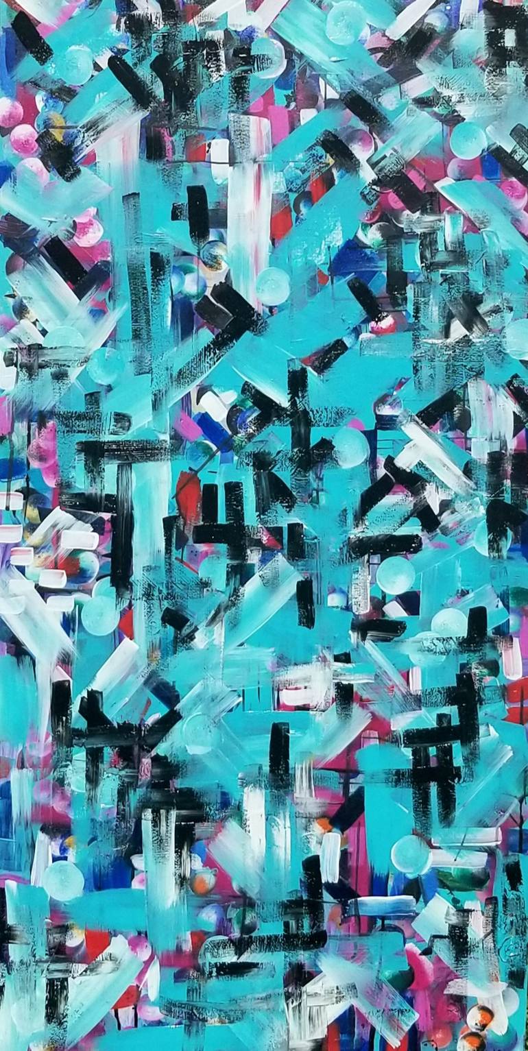 This painting evokes the colors of a holiday at the beach. The pink and white orbs that keep popping up in the composition was my imagery of snow cones and ice cream on the white silvery beach side.