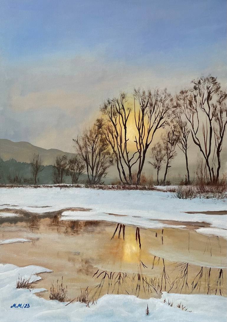 The painting captures a serene winter landscape with exceptional attention to detail, including snow, the reflection of the trees and sun on water, and the subtle gradients in the sky. The delicate handling of the light, with the sun peeking through the trees, creates a peaceful yet captivating atmo...