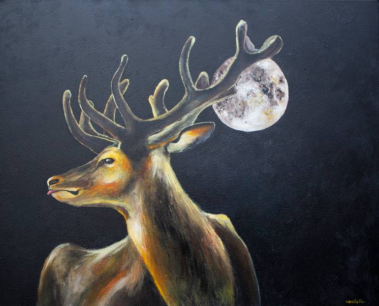 "Snow moon" A deer enjoying his time under the snow moon. - Acrylic painting on 100% cotton canvas. - 100 x 80 x 1.5 cm. - Varnished. - Signed and certificate of authenticity. - Signed on the front. - Ready to hang. Any questions please contact me :)