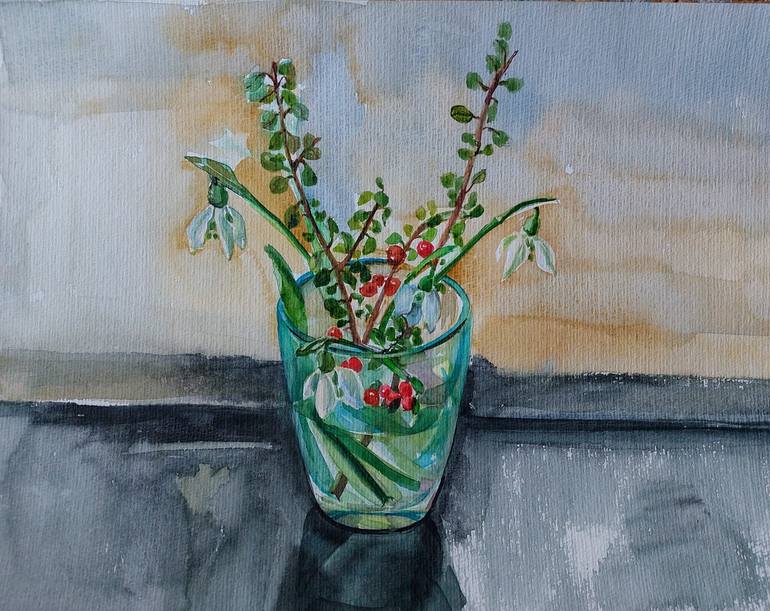 This is watercolor painting by first spring flowers snowdrops.