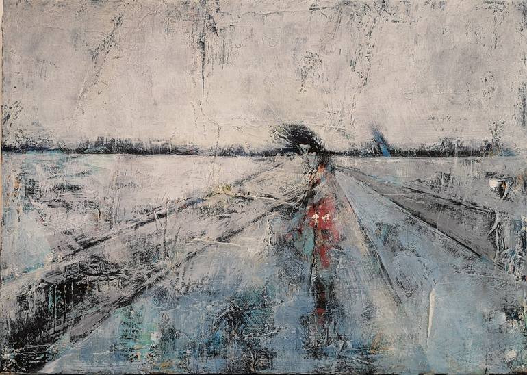 The image is inspired by a winter walk. A winter landscape, snow covers the fields, a path leads into the distance. Where does the path lead? The crunch of footsteps, hard frozen ground, clear cold air and the icy wind on your skin. The paint was applied with a palette knife, so relief-like structur...