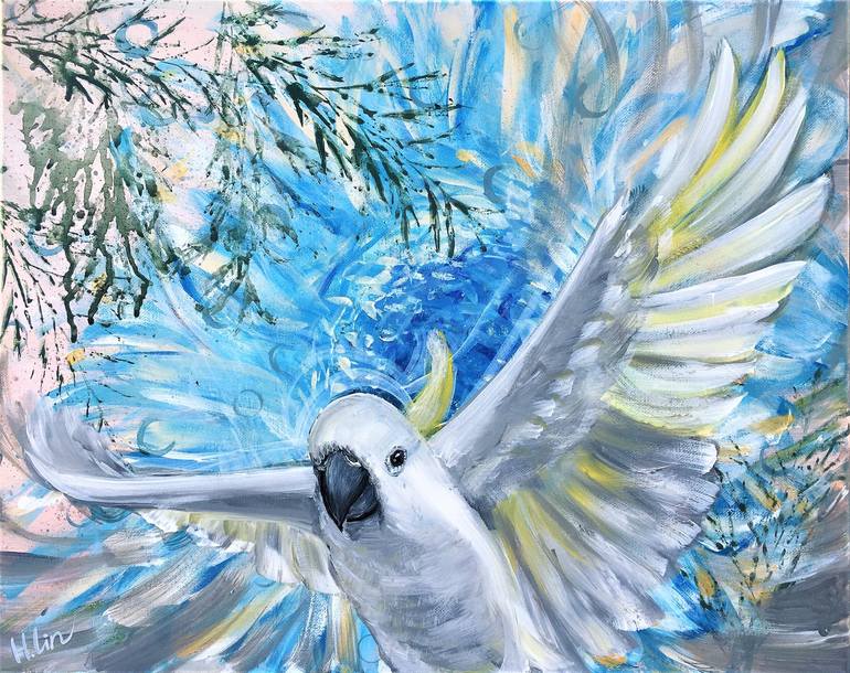 Soaring High – White Cockatoo 17/08/2020 51cm (W) x 41cm (H) x 1.5cm (D) By HSIN LIN Signed at front. Ready to hang. Side panel painted: Black Acrylic painting on gesso primed Acid free canvas Metallic Gold paint are used. It actually shines beautifully when you look at the physical painting. Aff...