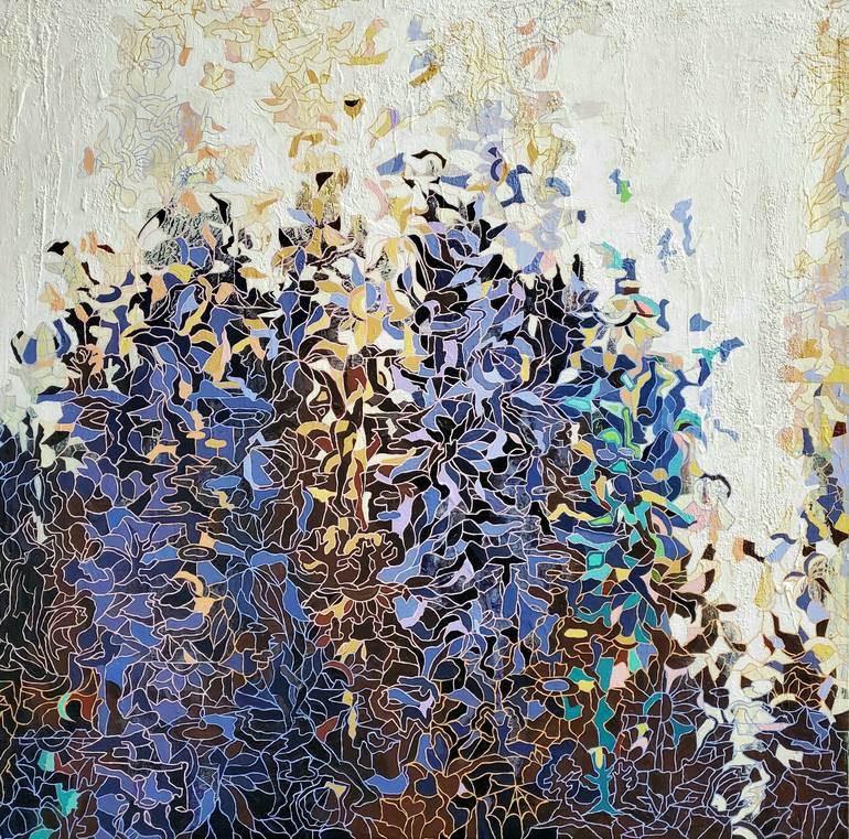 I was inspired by the flight of peacocks. Their bodies are heavy but they soar through the air weightlessly. The beautiful moment they open their wings when they prepare for landing. I hope the viewers can feel heavy and deep emotions but also feel uplifted. Acrylic,stucco on canvas