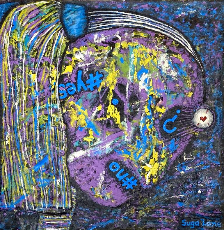 This piece was created through an intuitive channeling, beginning with freeform color expression followed by canvas communication. Suga Lane allowed the canvas to reveal the subject after peering into the colorful wonderland of lively neon hues. The zombie’s mouth appears as a hashtag because the vo...