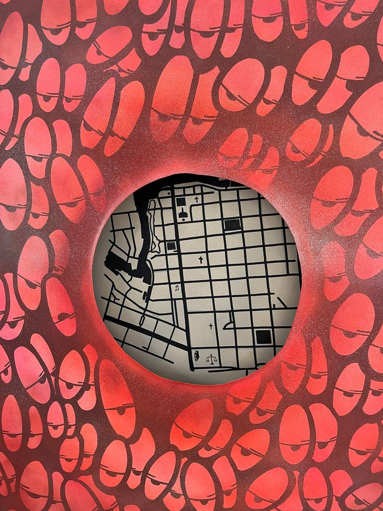 For my first "real" art exhibition the theme was circle. For me it ended up with this painting/slash creation. The words behind it is "I am looking at the society thru my art". Thats way there's a lot of eyes and why I have cut a circular hole in the canvas. The thing you see thru the hole is the ci...
