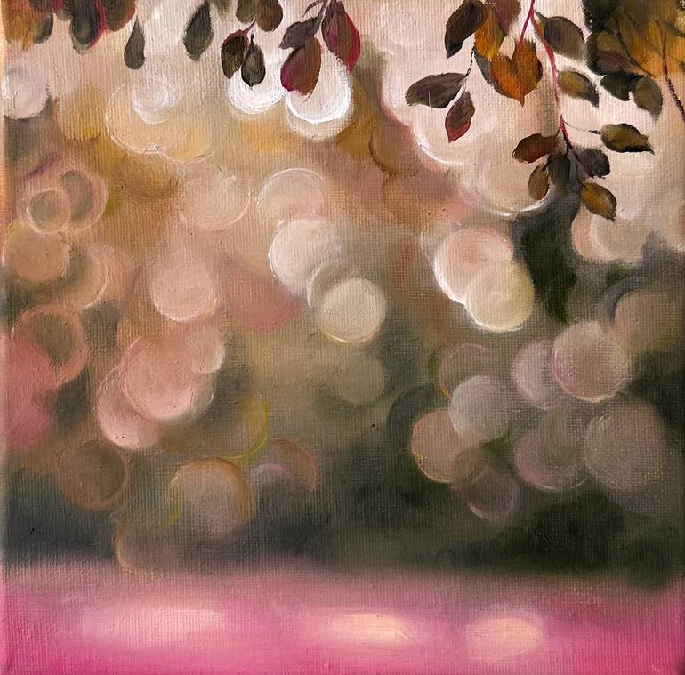 "Original oil painting on 20x20 cm canvas Features glowing bokeh light and soft forms Warm earthy palette with red, green, and gold accents Delicate, floating botanical details Hand-painted and signed by the artist Perfect for cozy spaces, creative studios, or peaceful interiors Description So...