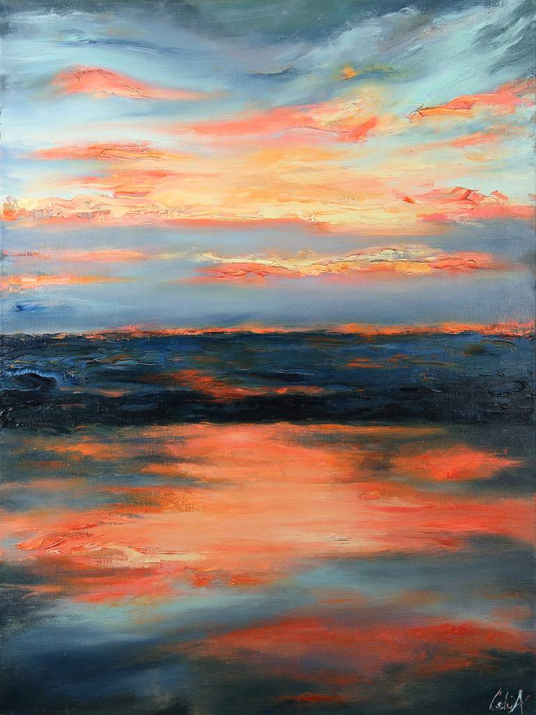 This beautiful moment happened at la Mer du Nord in Belgium, Westende. A sunset with colors so bright that it makes you realize we have been created by an artist, the Universe at large... I tried to find this specific color afterwards : this orange, pink, reddish colour is actually a bit fluorescent...