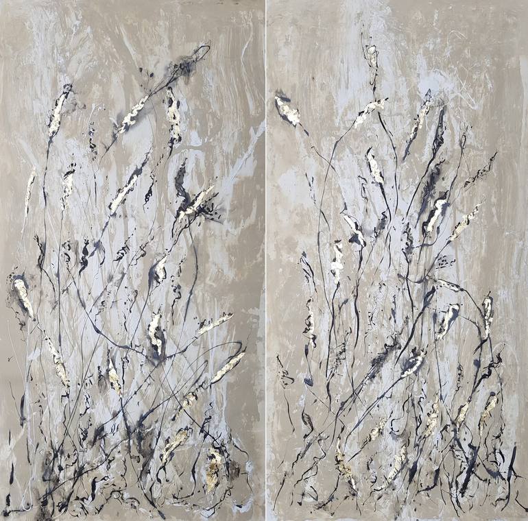 Solace is a huge study of native flora set against a marbled background of cream and white. Using a deep dark brown, highlights of gold and shades of cream and soft beige this abstract is perfect for a large wall. The metallic gold highlights the entire artwork and will change depending on the lig...
