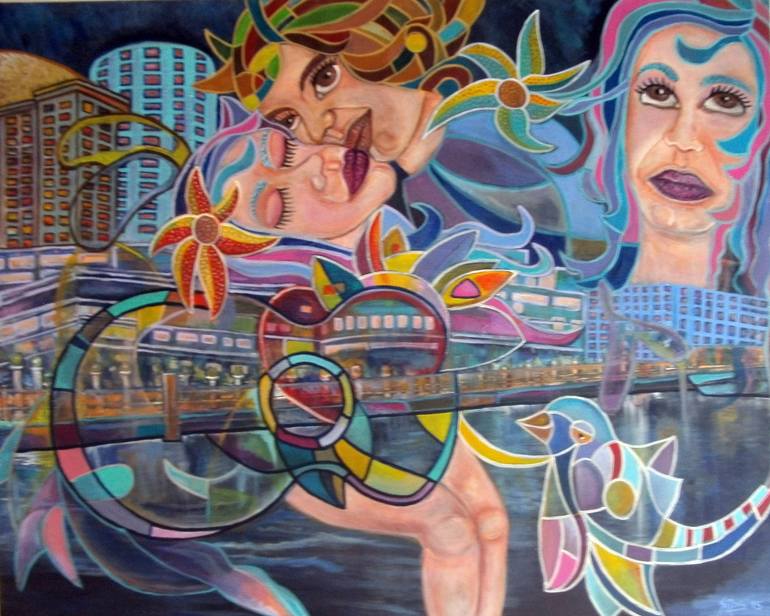 Title " Solayo moon in Buenos Aires" Magic Realism Paintings Original Measures: 31,4961 inch High x393,701 inch wide x 1,1181 deep.. Technique: Acrylics on canvas - Support :Canvas on Chassis.( ready to hang). Year 2015 This work is inspired by Love Instrumental Music and poetry Pablo Nerud...