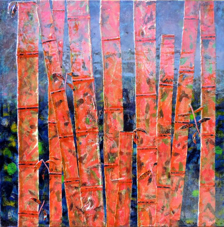 Painted canvas collaged onto painted canvas then mounted to wood. There is a shiny, clear splash of resin on the finish. The painting is textured and the canvas before it was painted was used as a drop cloth making it imperfect in its perfection. The painting has a painted edge frame and its ready t...