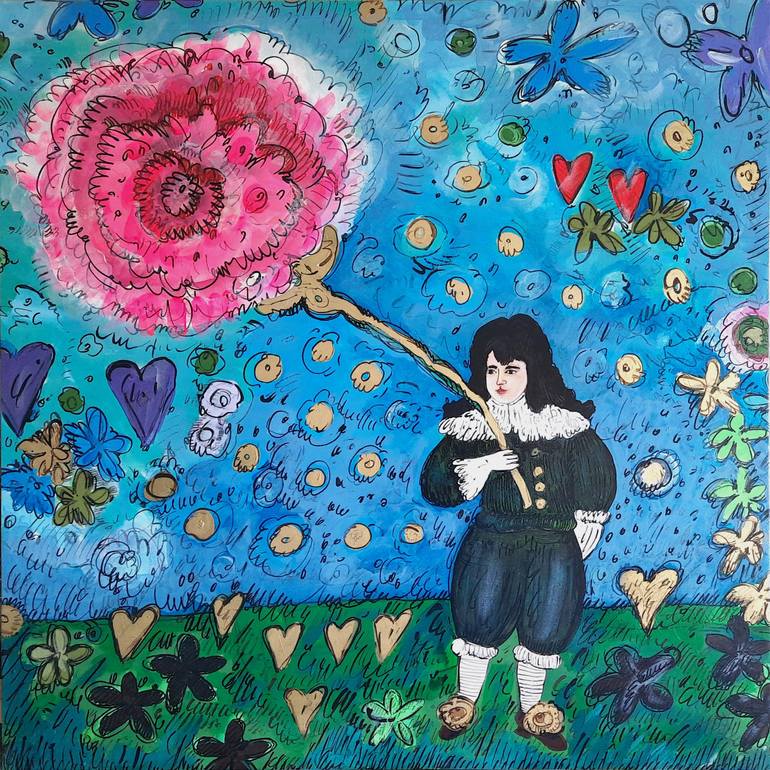 Fiorentina Giannotta (New York, 1964). Fiorentina Giannotta's poetics is characterized by a mix of history, irony and a lively exploration of colors and materials. Her works celebrate imperfect and ironic characters, immersed in imaginary and decorative landscapes, which invite the viewer to a visual and emotional participation, rather than a mere contemplation. Giannotta's characters, often inspired by historical figures or fictional protagonists, are conceived as "imaginary ancestors" with whom to establish an emotional companionship, creating a sense of personal connection and almost pleasant obsession. This choice is influenced by the ironic potential of the characters themselves. Elements such as lace, buttons, ribbons and bows add humor and lightness, making the works accessible and fascinating. Giannotta's influences range from great painters to novels and fiction, combining to create figures that express emptiness, rebellion and imperfection. Flowers and slogans are recurring elements in her works. Flowers, used as a decorative background, create artificial landscapes that reinforce the idea of an imaginary world. Slogans, such as “live, laugh and love” or “I am not the Mona Lisa of the Louvre but the Mona Lisa of your home”, add strength and participation to the works, involving the viewer more. Giannotta experiments with various materials in addition to classic acrylics, using industrial paints that allow her to play with consistencies and transparencies. Her favorite colors, such as Nissan green, Barbie pink, Barragan pink, butter yellow, oyster white and iridescent white, allow her to obtain both watercolor and thick effects. This technique, together with the small squiggles made with ceramic brushes, gives her works a three-dimensional and dynamic effect, further accentuating the vitality and energy of her compositions.