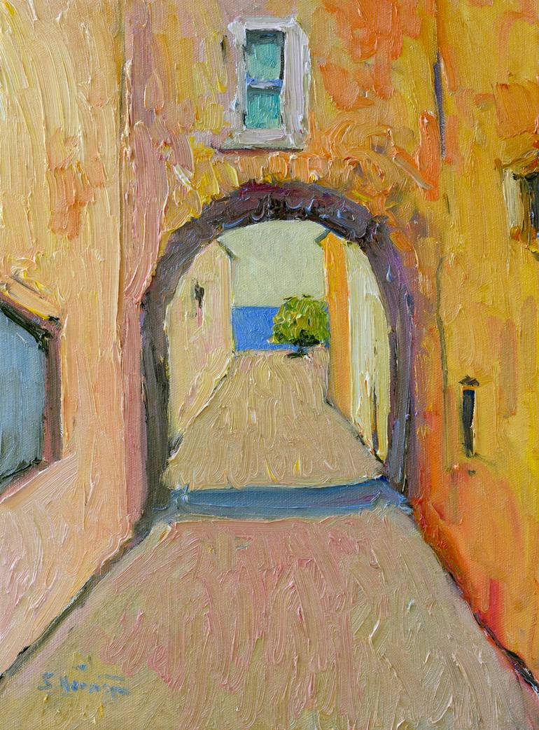 Old medieval walls, the arch, and the beautiful warm colors of the stone buildings together create a beautiful townscape full of peaceful atmosphere, The blue line of the sea far away becomes the central peace of the landscape, creating a contrast. The painting is on oil-primed canvas, stretched on...