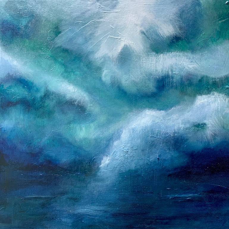 Somewhere Gathering is an atmospheric original abstract painting in acrylic and mixed media. Subtle hints of turquoise and deep dark blues sit on top of a textured surface. Part of the horizon series, this series explores connections with nature and the meditative value of looking towards a horiz...
