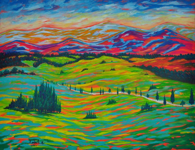 This painting was inspired by her last visit to Tuscany. "Tuscany landscapes continue to be a source of inspiration for her. Her yearly visit to the family home makes her most special inspiration for her paintings. Where everything seems magical, the lush green hills, cypress trees are the main uni...