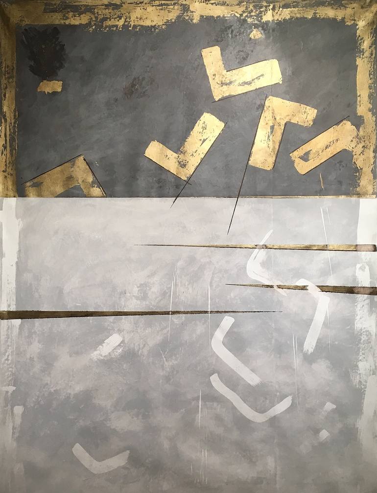 Golden and white nearly geometric motifs are the actual background of the painting left open when going over with dark and light grey