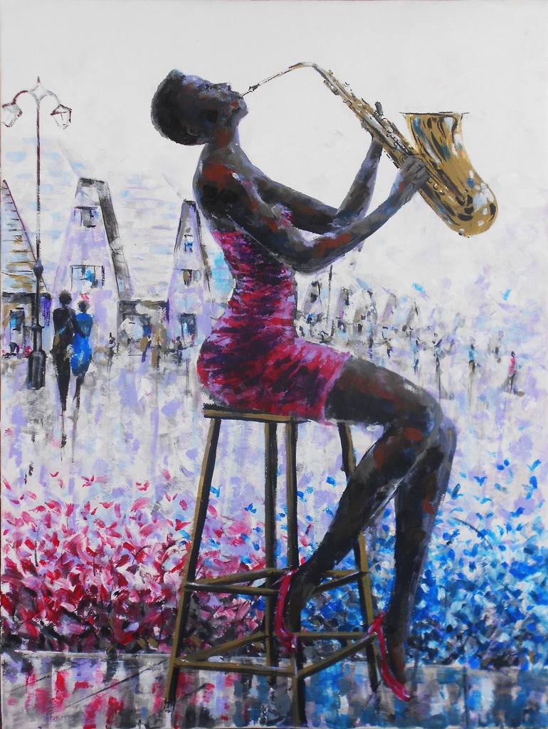 Mbongeni's work is inspired by music and dance, he captures motion, mood and the rhythm to engage the viewer into the beauty of his musical work. He considers his artwork as visual music and expresses his feelings musically on piece of canvas singing his songs with a paintbrush. The body of his work is largely figures, evolving from abstract images to recognisable elements using vibrant colours, texture and 3D effects.