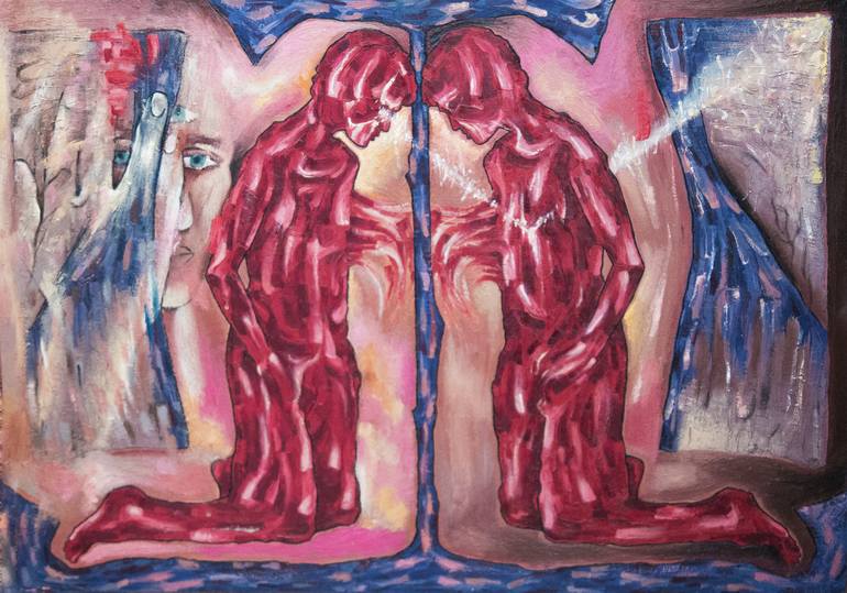 Painting: Oil on Wood. The unique connection of soulmates. Oil on the wood made by my original and unique technique exploring inner life of human being. Very plastic with 3D effects. From the series Agony of Love (2001-2003) 86x56. 2001